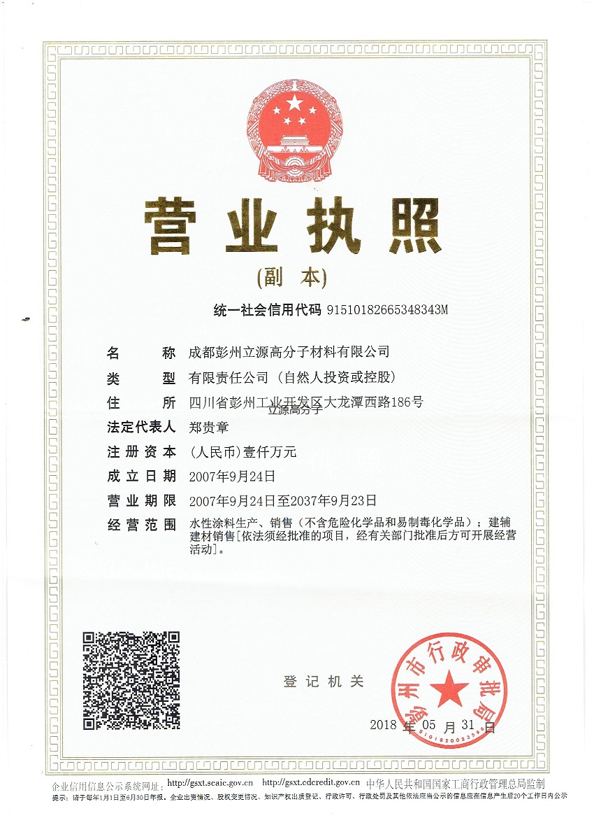 成都彭州立源高分材料有限公司成立于1998年,是一家专注于高端环保涂料研发、生产、销售及技术服务的高新技术企业(证书编号:GR202351005834)。历经二十余年的稳健发展,公司始终秉承“创新驱动、品质为先”的经营理念,为建筑装饰、工业制造等领域提供高性能、绿色化的涂料解决方案,致力于成为国内特种涂料领域的领先企业。
