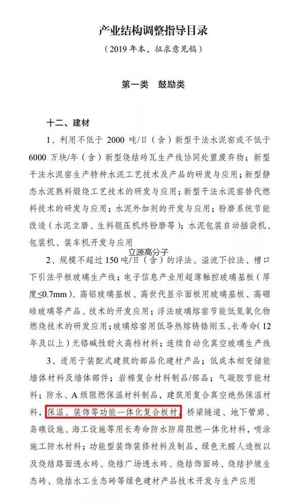 近日,国家发改委发布关于就《产业结构调整指导目录(2019年本,征求意见稿)》公开征求意见的公告,其中鼓励类第十二项第3条提到(适用于装配式建筑的部品化建材产品;低成本相变储能墙体材料及墙体部件;岩棉复合材料制品/部品;气凝胶节能材料;防水、A 级阻燃保温材料制品,建筑用复合真空绝热保温材料,